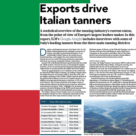 Nonostante la crisi economica prolungata del periodo 2008-09, l’industria conciaria italiana è riuscita ad aumentare le sue uscite, soprattutto nei mercati internazionali. È leader mondiale subito dopo la Cina per la produzione di pelli finite, ed è fornitore di “lusso” per i più importanti marchi in tutto il mondo. L’ultima produzione e i dati di esportazione mostrano un aumento rispetto ai valori pre-crisi. Circa il 30% di tutte le pelli finite esportate a livello internazionale sono “Made in Italy”; diventando un punto di riferimento per la qualità e l’avanguardia per la tutela dell’ambiente, consentendo alle pelli italiane di posizionarsi nella fascia alta del mercato.