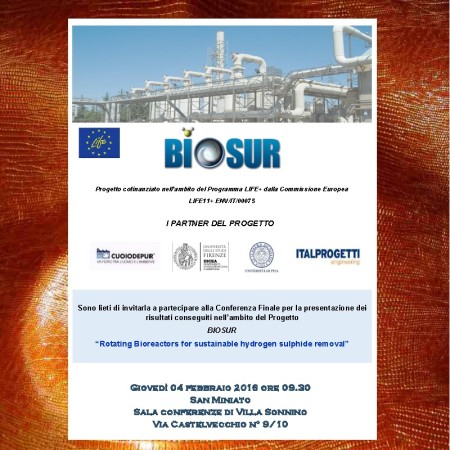 Il progetto BIOSUR, cofinanziato dall’Unione Europea nell’ambito del programma LIFE+, è stato realizzato nel settore delle attività sperimentali e delle continue ricerche svolte nel CER2CO (Centro Ricerca Reflui Conciari), il laboratorio congiunto università-impresa nato dalla collaborazione tra università di Firenze e Consorzio Cuoiodepur e della collaborazione sinergica, ormai pluriennale, tra i partner del progetto. Lo sviluppo progettuale ha previsto l’implementazione di una tecnologia innovativa per il trattamento e il contenimento delle emissioni odorigene con l’obiettivo di dimostrare a livello locale e promuovere a livello europeo, l’applicabilità di tale soluzione per la mitigazione dell’impatto ambientale derivante dal rilascio di idrogeno solforato e di altri composti ridotti dello zolfo. Nel corso del seminario di chiusura del progetto, i relatori di ciascun partner Dr. Gualtiero Mori per il Consorzio Cuoiodepur, Dr. Giulio Munz e Ing. Francesco Spennati per il Dipartimento di Ingegneria Civile e Ambientale dell’Università di Firenze, Dr.ssa Claudia Vannini per il Dipartimento di Biologia dell’Università di Pisa e Ing. Gabriele D’Elia per Italprogetti SpA, hanno illustrato i risultati conseguiti durante tutto il periodo della sperimentazione, i vantaggi da un punto di vista economico e ambientale e le opportunità offerte da questa soluzione innovativa per una gestione più efficiente del trattamento degli effluenti nel distretto conciario ed in altri ambiti applicativi.