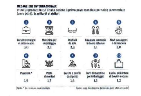 Dalla lettura dell’analisi, pubblicata da Il Sole 24 Ore, emerge allora che nel 2016 su 5.206 categorie di prodotto scambiate a livello internazionale, l’Italia si piazza 1.424 volte tra i primi 5 Paesi al mondo per bilancia commerciale con l’estero. Il comparto abbigliamento-moda detiene nel totale 383 posizioni di eccellenza, per un surplus commerciale di 37 miliardi di dollari, mentre l’arredo-casa 68 posizioni. Buone nuove anche per gli accessoristi: con un saldo di 279 milioni di dollari, l’Italia è prima anche per fibbie e fermagli in metallo per abbigliamento.