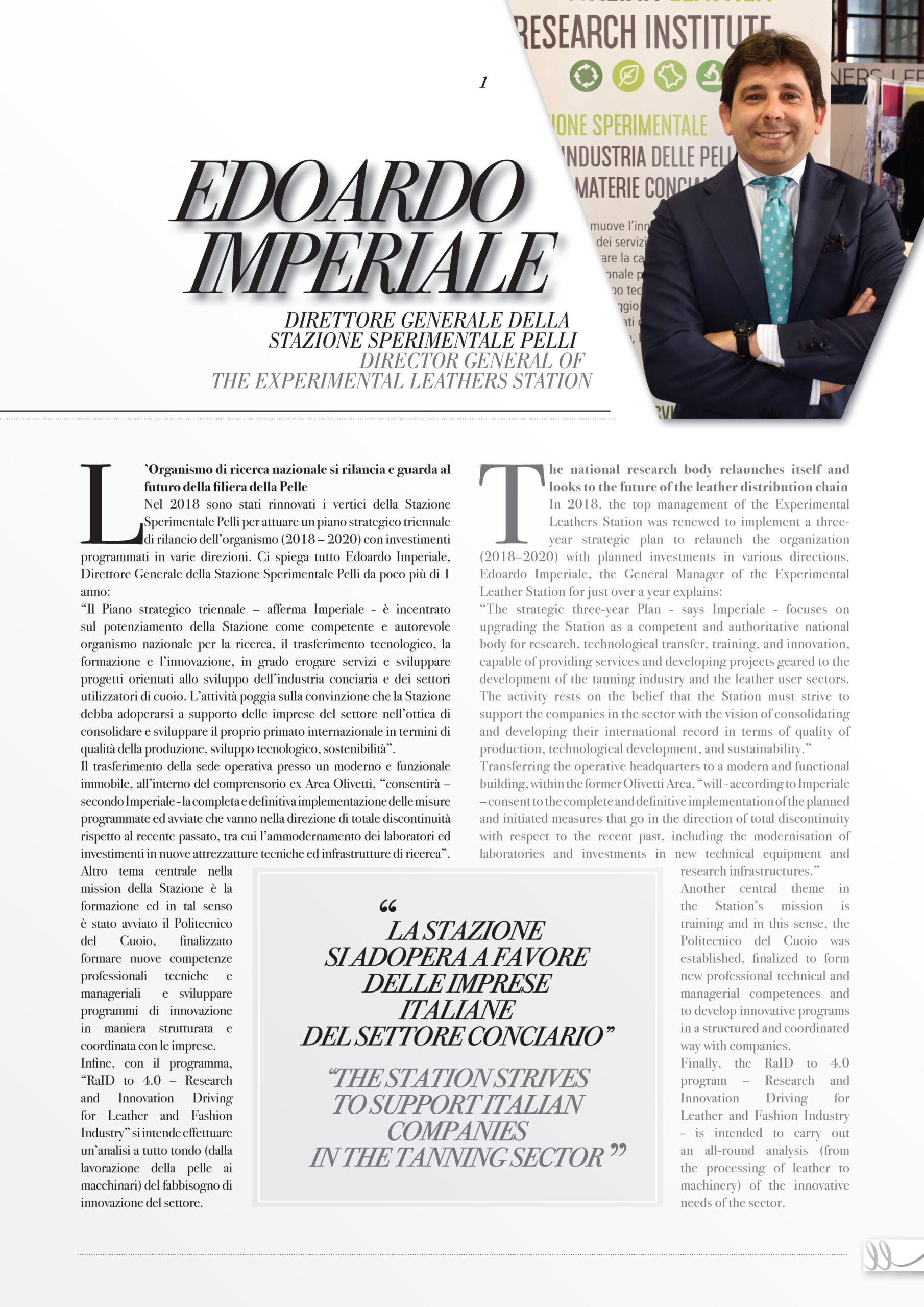 Nel numero di Settembre 2018, un’intera pagina è dedicata alle parole del Dg: “Il Piano strategico triennale di rilancio (2018-2020) dell’organismo – afferma Imperiale a LL International – è incentrato sul potenziamento della Stazione come competente e autorevole organismo nazionale per la ricerca, il trasferimento tecnologico e l’innovazione, in grado erogare servizi e sviluppare progetti orientati allo sviluppo dell’industria conciaria e dei settori utilizzatori di cuoio”.