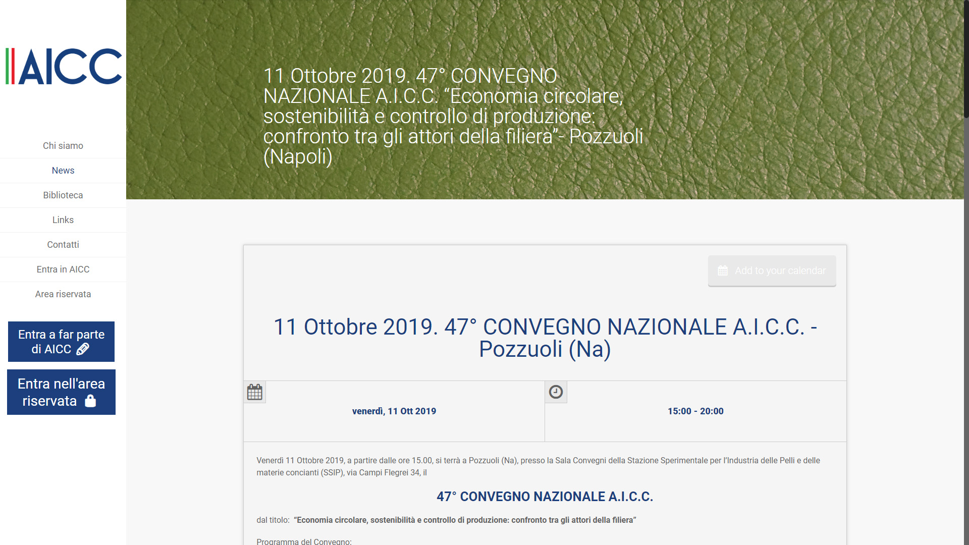Venerdì 11 Ottobre 2019, a partire dalle ore 15.00, si terrà a Pozzuoli (Na), presso la Sala Convegni della Stazione Sperimentale per l’Industria delle Pelli e delle materie concianti (SSIP), via Campi Flegrei 34, il 47° CONVEGNO NAZIONALE A.I.C.C. dal titolo: “Economia circolare, sostenibilità e controllo di produzione: confronto tra gli attori della filiera”