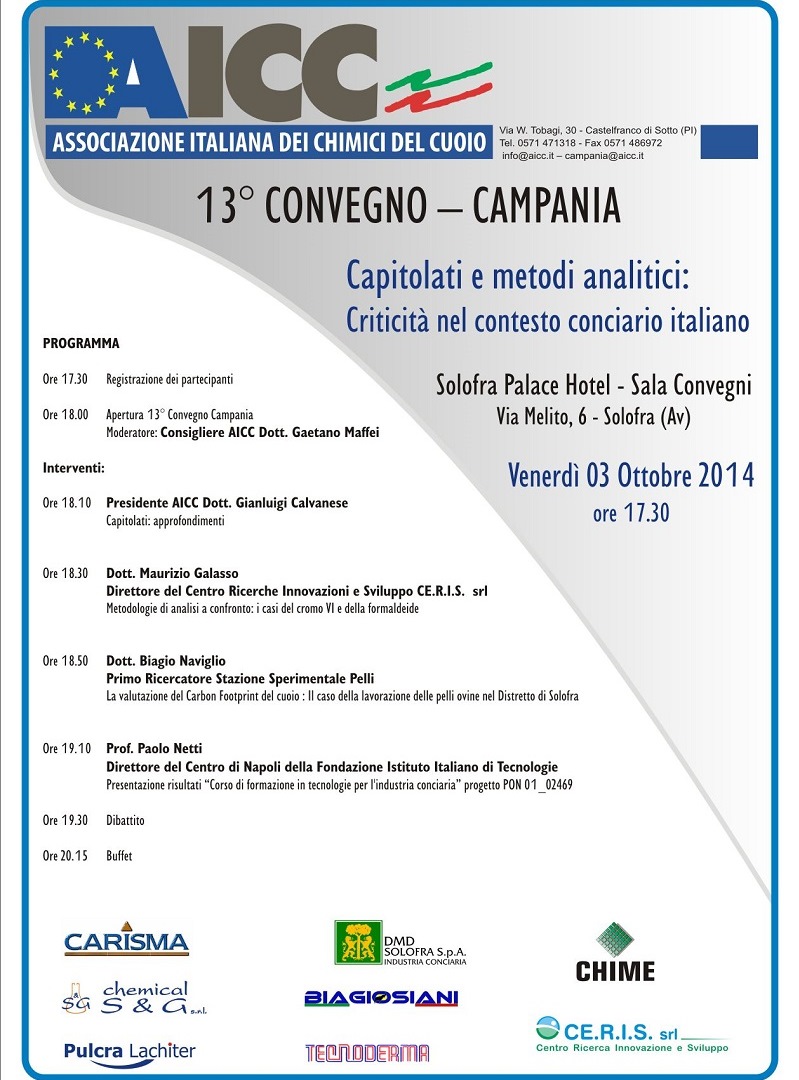 Venerdì 11 Ottobre 2019, a partire dalle ore 15.00, si terrà a Pozzuoli (Na), presso la Sala Convegni della Stazione Sperimentale per l’Industria delle Pelli e delle materie concianti (SSIP), via Campi Flegrei 34, il 47° CONVEGNO NAZIONALE A.I.C.C. dal titolo: “Economia circolare, sostenibilità e controllo di produzione: confronto tra gli attori della filiera”
