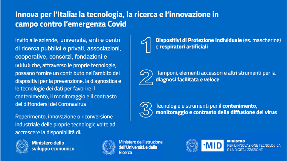 Innova per l’Italia: tecnologia e ricerca contro emergenza Covid-19
