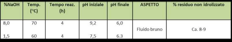Rapporto rasatura/acqua: 1:10; Rapporto NaOH 30%/rasatura: ca. 8% per la prima fase di idrolisi alcalina, seguito da circa 1,5% per portare il pH a quello di lavoro per l’enzima (circa 7,5); Rapporto Enzima/rasatura: ca. 1%. Temperatura di reazione: circa 70°C per idrolisi basica, 60°C per idrolisi enzimatica. Tempo di reazione: 4 ore idrolisi basica, 4 ore idrolisi enzimatica.