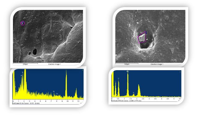 Come in altri casi di difetti, questa tipologia di problematiche può essere affrontata attraverso approcci conoscitivi e preventivi, che passano per il ricorso a molteplici metodi di diagnostica strumentale, come quelli basati sull’utilizzo di tecniche spettroscopiche (UV-VIS/ATR-IR), tecniche di microscopia ottica ed elettronica a scansione con sonda a raggi-X (Fig.2), oltre che di altre tecniche strumentali, come quella calorimetrica, con sistema DSC/TGA, per l’analisi termica dei campioni.