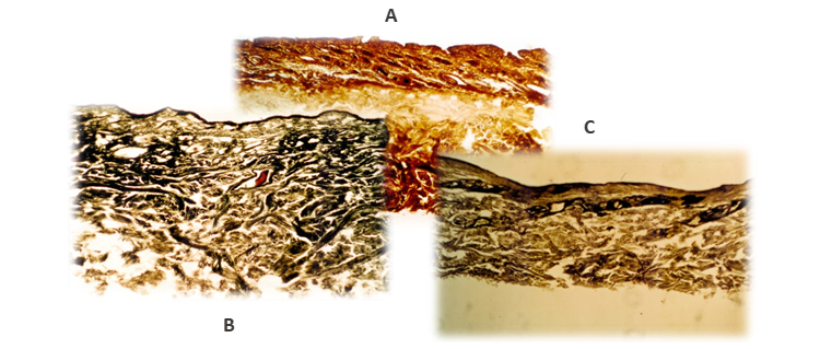 Fig.2: Analisi comparativa tra campioni di pelle di diversa origine animale (A-Vitello; B– Bovina adulta; C-Caprina)