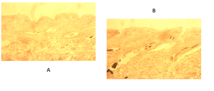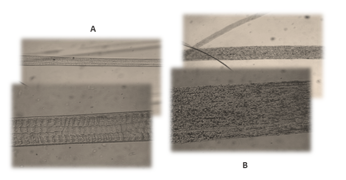 Fig.4: Analisi comparativa tra campioni di pelo di coniglio (Oryctolagus cuniculus) – A e campioni di pelo sintetico -B