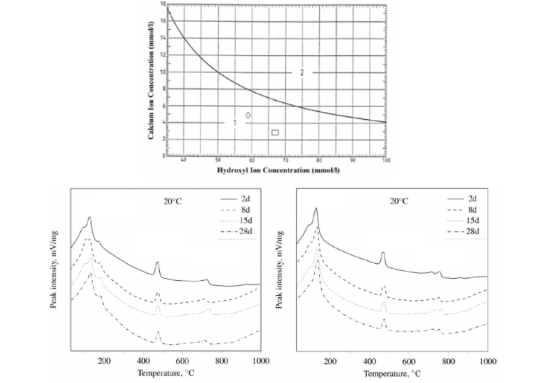(in basso) Confronto tra analisi termica per il cemento standard (a sinistra) ed il cemento con ceneri (a destra) idratati a 20°C per tempi variabili tra 2 e 28 giorni, che mostra la similitudine delle fasi sviluppate.