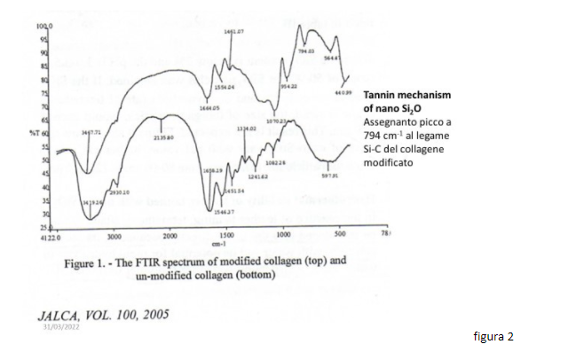 Purtroppo, il legame che può instaurarsi fra l’ossigeno del silano ed un carbonio o azoto di un gruppo funzionale del peptide è raro, debole o reversibile nelle condizioni usuali in cui si può operare in fase di concia, sebbene sia riportata, in letteratura, alcune evidenze di legame come quello dell’esempio in figura 2 dove si riporta la formazione del legame Si-C evidenziata con tecniche IR.