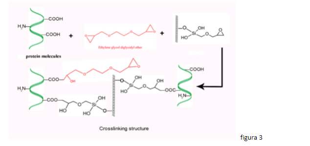 Ritornando, invece nel caso precedente con il glicidossi silano, si può sfruttare, in concomitanza con la polimerizzazione del silano, la chiusura della reticolazione con un altro epossido terminale del polimero su una funzionalità amminica di una seconda catena peptidica, come nell’esempio di figura 3, laddove un supporto è una matrice inorganica come la silica. Quest’ultima è infatti una tecnica utilizzata per l’immobilizzazione di proteine come gli enzimi su supporti solidi, come ad esempio il gel di silice, per reazioni enzimatiche con recupero dell’enzima.
