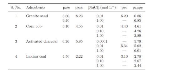 - Determination of points of zero charge of natural and treated adsorbents J NASIRUDDIN KHAN∗ and ANILA SARWAR† ∗Department of Chemistry, University of Karachi, Pakistan †Fuel Research Centre, PCSIR Karachi, Pakistan 2007 Surface Review and Letters 14(03):461-469