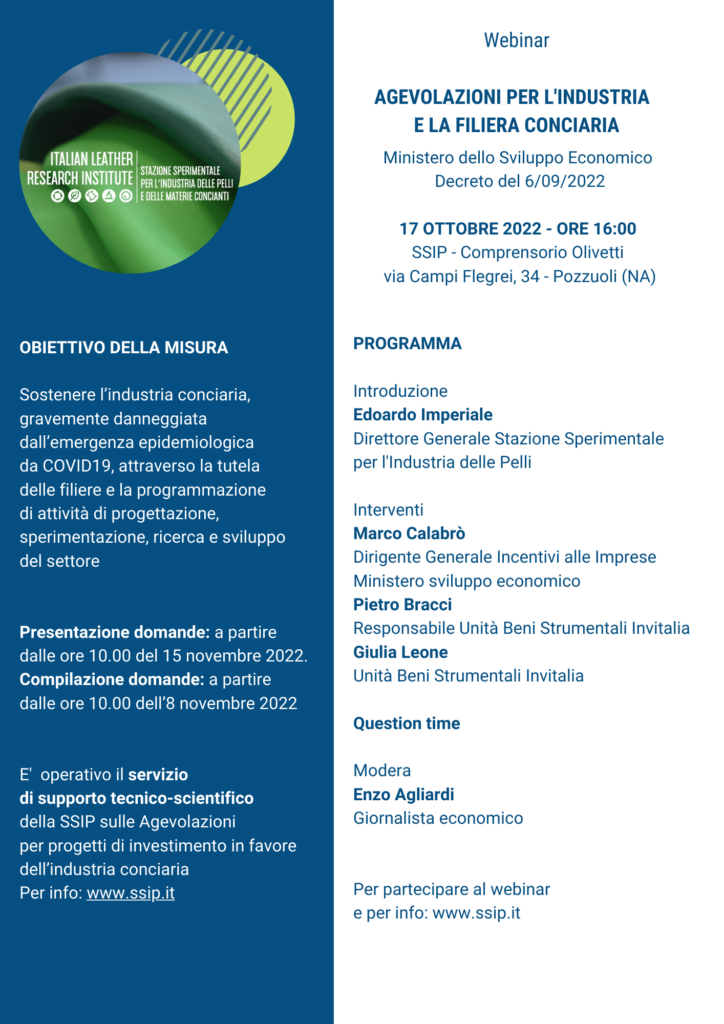 Il 17 ottobre 2022 alle ore 16 si terrà un webinar dedicato alle AGEVOLAZIONI PER PROGETTI DI INVESTIMENTO IN FAVORE DELL’INDUSTRIA CONCIARIA E PER LA TUTELA DELLA FILIERA DEL SETTORE CONCIARIO, varate dal Ministero dello Sviluppo Economico con Decreto 6/09/2022.