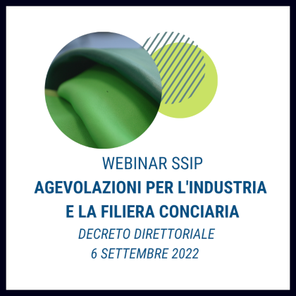 Il 17 ottobre 2022 alle ore 16 si terrà un webinar dedicato alle AGEVOLAZIONI PER PROGETTI DI INVESTIMENTO IN FAVORE DELL’INDUSTRIA CONCIARIA E PER LA TUTELA DELLA FILIERA DEL SETTORE CONCIARIO, varate dal Ministero dello Sviluppo Economico con Decreto 6/09/2022.