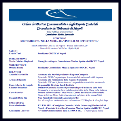 Il direttore Generale della Stazione Sperimentale per l’Industria delle Pelli e delle materie concianti Edoardo Imperiale, interverrà al convegno intitolato “Sostenibilità nella moda: da vincolo a opportunità” promosso dall’Ordine dei Commercialisti di Napoli.