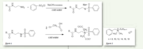 La tecnologia innovativa studiata si è rivolta ad una nuova sintesi di composti a base di Sali di ammonio quaternari attraverso la reazione di quaternizzazione di ammine contenute in idrolizzati proteici secondo lo schema esplicitato in figura 1 dove R rappresenta, appunto, un residuo peptidico. I composti di ammonio quaternario hanno dimostrato di avere attività antimicrobica. Alcuni composti di ammonio quaternario vengono usati, infatti, come antimicrobici e disinfettanti. Sono efficienti anche contro i funghi, le amebe e i virus con involucro ed un esempio classico è il benzalconio cloruro in figura 2. Questi composti possono avere il vantaggio di potersi legare sul pellame grazie ai gruppi carbossilici molto suscettibili alla reazione