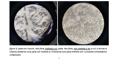 Il prodotto sintetizzato è stato applicato a spruzzo e, sulle pelli trattate misurata l’attività antibatterica su entrambi i lati, fiore e carne, evidenziando un buon effetto attraverso il metodo semiquantitativo, EN ISO 20645:2004. La crescita batterica sotto il provino lato 1 = Nessuna; Crescita batterica sotto il provino lato 2 = Nessuna. Ceppo utilizzato per l’inoculo: