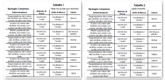 Escherichia coli – ATCC 8739, Ceppo gram negativo, concentrazione inoculo UFC/ml 150000000. Sulle pelli processate sono state, inoltre, verificate le performance minime d’entrata, riguardanti i requisiti fisici in elenco nelle tabelle sotto che rappresentano la pelle non trattata, nella tabella 1 e trattata con il prodotto antibatterico nella tabella 2 Sebbene le pelli non abbiano superato il test relativo ai 50 colpi con soluzione sanificante, hanno, comunque, superato con successo tutti gli altri test fisici, riscontrando un effettivo mantenimento delle caratteristiche di resistenza nonostante il trattamento antibatterico. Rimangono, ancora, da valutare la persistenza e la efficacia del trattamento antibatterico dopo cicli ripetuti di usura o di prove di durabilità.