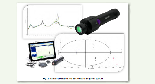 questo sistema, sono stati studiati campioni di pelle, prodotti chimici e acque di concia. Nello specifico esempio riportato in figura 1, sono state analizzate acque di concia primae dopo i processi selezionati: le differenze in termini d’intensità suggeriscono una certa discriminazione tra i campioni, laddove applicando metodi statistici multivariati, quali l’analisi delle componenti principali (PCA), è stato possibile apprezzare ed individuare raggruppamenti o trend nei dati acquisiti; tale studio preliminare ha consentito di evidenziare il potenziale della tecnica nella possibile messa a punto di un sistema di gestione automatizzata di processo. Più in generale, tale studio di fattibilità ha consentito di mettere in luce la versatilità del MicroNIR