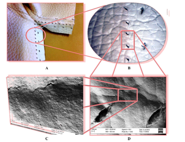 Sebbene la più comune alterazione della colorazione dei cuoi chiari riguardi i fenomeni di ingiallimento, è sovente possibile riscontrare su tali articoli problematiche di tipo diverso, come la presenza di aree con colorazione rosa/”rosa- salmone”. Questa tipologia di difetti è stata oggetto di puntuali approfondimenti nell’ambito di lavori dedicati (Florio, C. et al., 2021; Florio, C. et al., 2009), che hanno in primo luogo evidenziato la potenziale relazione delle cause della problematica con l’esposizione degli articoli a condizioni di invecchiamento, particolarmente in merito all’esposizione alla luce.