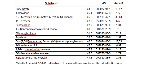 Gli studi svolti hanno in primo luogo evidenziato il possibile coinvolgimento di antiossidanti nella problematica: in un lavoro precedente (Florio, C. et al., 2009) è stata difatti riscontrata nei soli campioni difettati la presenza di un precursore di carotenoide (lycopersene, CAS: 502-62-5), che è stato correlato alla problematica, mentre in un più recente lavoro (Florio, C. et al., 2021), come è possibile osservare in Tabella 1, è stata riscontrata la presenza di 2,2′-metilen-bis-(4-metil-6-terz.-butil-fenolo), CAS: 000119-47-1, tr: 26,6 min). Questo antiossidante può essere soggetto ad alterazioni cromatiche dovute ad invecchiamento foto/termo- climatico; sebbene sia più comune osservare in questo caso l’ingiallimento del prodotto, un ulteriore viraggio di colore verso il rosa in condizioni di “over-aging” può considerarsi causa potenziale del fenomeno (Hill, D.M., 2019; Fleck, J.E., 1997; Pospišil, J., 2008).