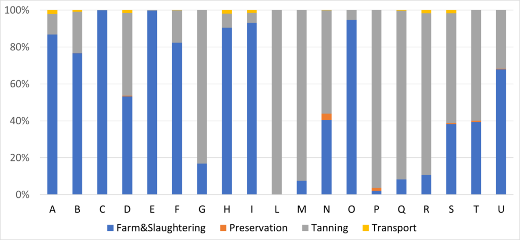 In questa sede tratteremo brevemente i risultati caratterizzati del ciclo di vita di una pelle X, che comprende l’allevamento e la macellazione, il trasporto delle pelli grezze dal macello alla conceria, la conservazione e la concia. In Figura 2 sono rappresentate come le quattro fasi prese in considerazione impattino considerando i valori in percentuale per un metro quadro di prodotto pelle.