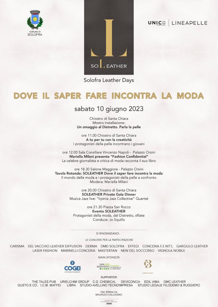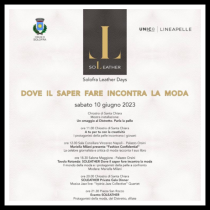 La manifestazione SoLeather, acronimo di Solofra e pelle ma anche di sole e pelle, a sottolineare il legame tra il centro avellinese e la tradizione conciaria, che lo ha reso celebre in tutto il mondo, è nata da una iniziativa dell’Amministrazione di Nicola Moretti e di UNIC Concerie Italiane, fortemente voluta dall’Assessore Comunale Gabriele Buonanno.