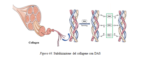 I gruppi aldeidici del DAS, ottenuti dall’ossidazione, reagiscono con i gruppi amminici del collagene andando a costruire una struttura reticolata con la formazione della base di Schiff. Nello specifico l’aldeide con l’ammina primaria va a formare un’aldoimmina. Figura 44.