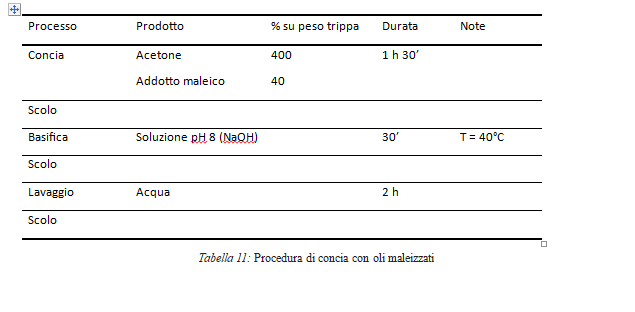 La fase concia viene effettuata in delle vasche che permettono l’impregnazione dell’olio, come nella concia tradizionale. L’olio funzionalizzato viene diluito in un solvente, in quanto ha una viscosità maggiore rispetto all’olio puro. La necessità di utilizzare del solvente ha molteplici vantaggi: permette di utilizzare una quantità di agente conciante inferiore, facilita l’impregnazione e nella fase di scolo il prodotto conciante si rimuove facilmente dalle superficie in cui non c’è stata l’interazione. La pelle, quindi, viene lasciata in un bagno di acetone e olio maleizzato, e successivamente viene fatta scolare per rimuovere il prodotto non reagito. Il bagno di olio maleizzato non avendo subito alcuna degradazione può essere utilizzato per la pelle successiva. Le prove vengono effettuate conciando con i prodotti maleizzati le pelli che hanno ricevuto preconce diverse. La procedura standard applicata su ogni pelle è riportata nella Tabella 11.