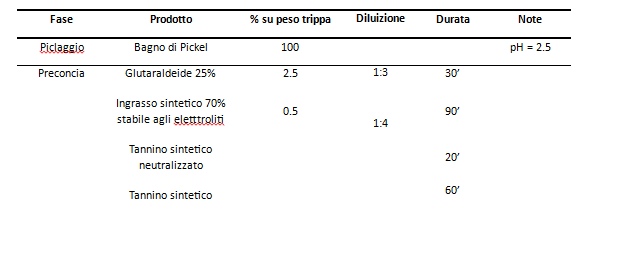 Il processo di concia viene effettuato su pelli bovine nelle quali sono già state effettuate tutte le operazioni di riviera fino al pickel (acido formico, acido solforico e cloruro di sodio a pH 2.5).