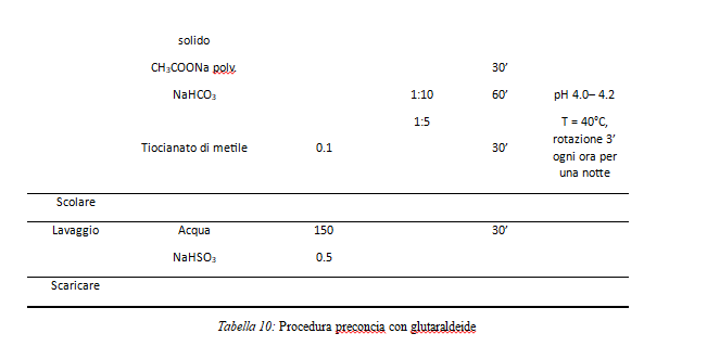 La procedura della preconcia con glutaraldeide è riportata nella Tabella 10.