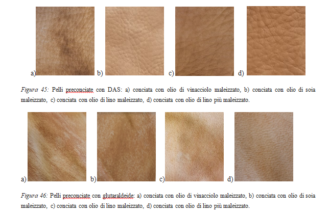 In entrambe le preconce la Tg più elevata è stata ottenuta con l’agente conciante ottenuto dall’olio di lino. Differentemente da come ci si aspettava l’olio di lino maggiormente maleizzato non ha stabilizzato più efficacemente la pelle, molto probabilmente perché la maggiore viscosità richiedeva un quantitativo di solvente più elevato. Ottenendo dei buoni valori con l’utilizzo dell’olio di lino maleizzato con una quantità di reagente inferiore, non sono state effettuate ulteriori prove con l’olio più maleizzato. L’olio di vinacciolo maleizzato e l’olio di soia maleizzato hanno conciato la pelle in modo poco uniforme; infatti, le Tg variavano molto in base alla zona in cui veniva prelevato il
