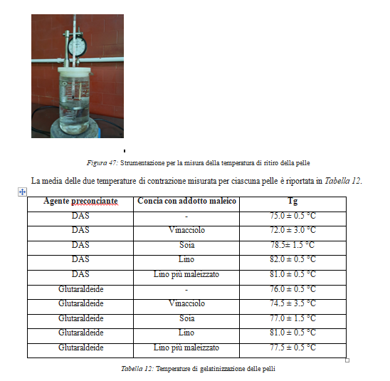 Al fine di valutare l’effetto conciante di ciascun olio si sono eseguiti i test per la valutazione della temperatura di contrazione (Tg) secondo ISO 3380:2015, Leather – Physical and mechanical tests – Determination of shrinkage temperature up to 100°C.