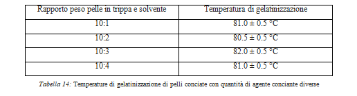 Le prove di concia vengono effettuate utilizzando quantità diverse di agente conciante, Tabella 14, e registrando le Tg delle pelli. I risultati ottenuti mostrano che è possibile conciare con il 10% su peso pelle in trippa di agente conciante poiché la stabilizzazione è equivalente a quella che si ottiene utilizzando il 40% di agente conciante.