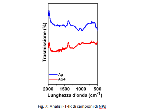 Tali tecniche sono risultate efficienti anche a monitorare gli effetti delle funzionalizzazioni applicate alle NPs per consentirne una migliore dispersione nei chemicals a base acquosa, utili per le applicazioni in conceria. Ulteriori informazioni riguardo la conferma dell’avvenuta funzonalizzazione, attraverso piccole molecole organiche con gruppi funzionali polari, è possibile mediante tecniche come Analisi Termogravimetrica (TG-DTG) e Analisi Spettroscopica (FT-IR) (Figure 6 e 7).
