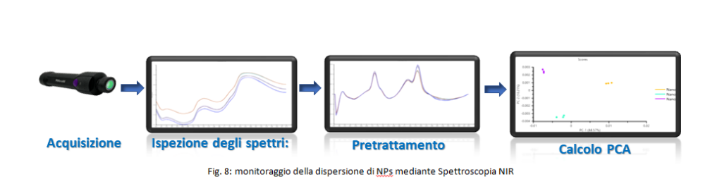 Sviluppi futuri riguardo agli aspetti di monitoraggio dell’efficienza delle dispersioni di NPs nei film di rifinizione, comprendono infine sistemi di Controllo Non Distruttivo, che si prestano ad essere impiegati efficacemente anche in ambiente di lavoro, restituendo informazioni fondamentale in tempi estremamente rapidi, come nel caso di un sistema di Spettroscopia NIR (Near Infrared Spectroscopy), impiegato per monitorare la dispersione delle NPs metal-based disperese nei polimeri di rifinizione, al fine di conferire alle nuove generazioni di cuoi le proprietà aggiunte sopra descritte (Figura 8).