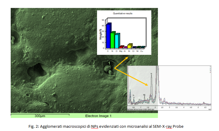 In tale contesto, le tecniche di microscopia elettronica, Scanning Electron Microscopy (SEM) and Transmission Electron Microscopy (TEM), possono risultare efficaci per evidenziare alcuni specifici aspetti riguardo l’efficacia della dispersione di nanoparticelle nei formulati di rifinizione e sulla superficie delle pelli trattate; a titolo esemplificativo, come si può osservare dalla figura 2, la presenza di eventuali agglomerati macroscopici di NPs, può essere efficacemente rilevata dalla analisi morfologica al SEM, coadiuvata dalla microanalisi con X-ray Porbe. Al contrario, una mancata identificazione degli agenti ricercati, sia all’analisi morfologica che attraverso l’analisi della composizione elementare al SEM-EDX, evidenzia un buon livello di dispersione.