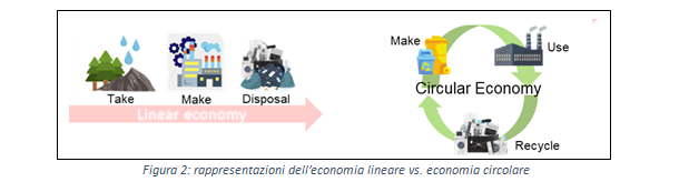 La transizione da un’economia lineare ad una circolare (Figura 2) si pone come l’unica soluzione per la salvaguardia del pianeta, in un’ottica di sostenibilità economica, che rappresenti una nuova opportunità di sviluppo vista in termini di competitività, innovazione, ambiente e occupazione.