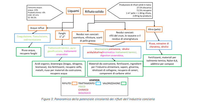 L’industria conciaria è tradizionalmente rappresentativa dei principi dell’economia circolare, inquanto ricicla come materia prima gli scarti dell’industria agroalimentare: la pelle grezza. Inoltre, si impegna costantemente nella diffusione di procedure e sviluppo di tecnologie (BAT Best Available Techniques) seguendo principi di sostenibilità socio-economica e ambientale e circolarità, con l’obiettivo di fornire tecniche per Prevenire, quando fattibile, o Ridurre gli impatti del settore sull’ambiente in termine di consumi di materie prime e emissioni di rifiuti e scarti6.