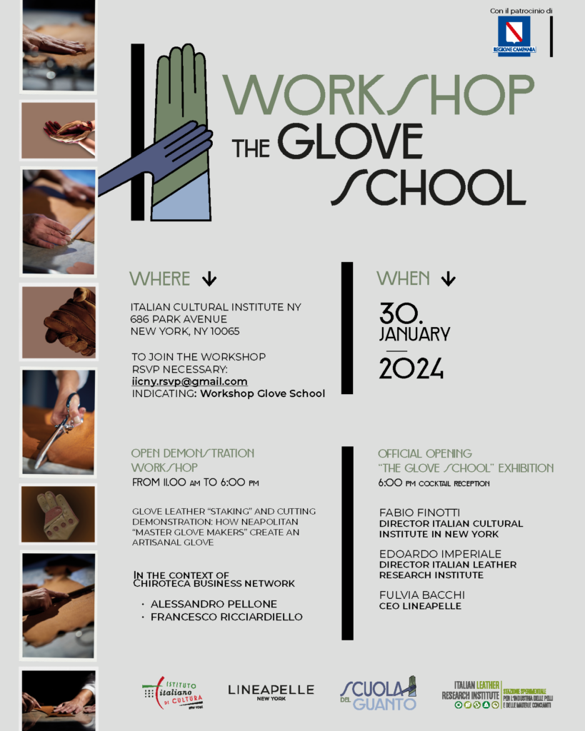 Nella venue dell’Istituto di Cultura Italiana a New York, sito in Park Avenue, che ospita la mostra dedicata a “La Scuola del guanto”, come già annunciato il prossimo 30 gennaio dalle ore 11 si terrà il workshop interamente dedicato all’arte guantaria.
