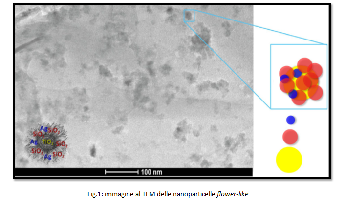 Tali nanoparticelle (NPs), sono state realizzate partendo da NPs di Ag, TiO2 e SiO2; tali nanoparticelle, vanno a formare una struttura “a forma di fiore” in cui il “pistillo” è formato da NPs di TiO2 ed i “petali” che lo circondano da nanoparticelle di argento e silice, le cui dimensioni sono dell’ordine di dieci nanometri. Le NPs multifunzionali “flower-like” sono state caratterizzate sia dal punto di vista chimico-fisico che morfologico-dimensionale, attraverso diverse tecniche, tra cui: Diffrazione di raggi X (XRD); Microscopia Elettronica a Trasmissione (TEM); Microscopia Elettronica a Scansione (SEM), accoppiata una sonda per spettroscopia a raggi X a dispersione di energia (EDS); Nanoparticles Tracking Analysis (NTA); Termogravimentria (TG-DTG); Spettroscopia Infrarossa FT-IR.
