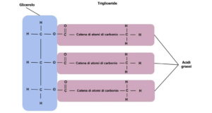 Un trigliceride è composto da una molecola di glicerina alla quale sono legate tre catene di acidi grassi, che possono essere anche diversi tra loro e la cui lunghezza ed il cui numero di doppi legami presenti ne determina variazioni nel comportamento chimico. Una maggiore lunghezza ne determina un maggior carattere apolare e punti di fusione iù elevati, così come un maggior numero di insaturazioni li rende più polari oltre che con una maggiore presenza di punti di attacco da parte di agenti esterni che ne possono provocare l’ossidazione o altri tipi di decomposizioni.
