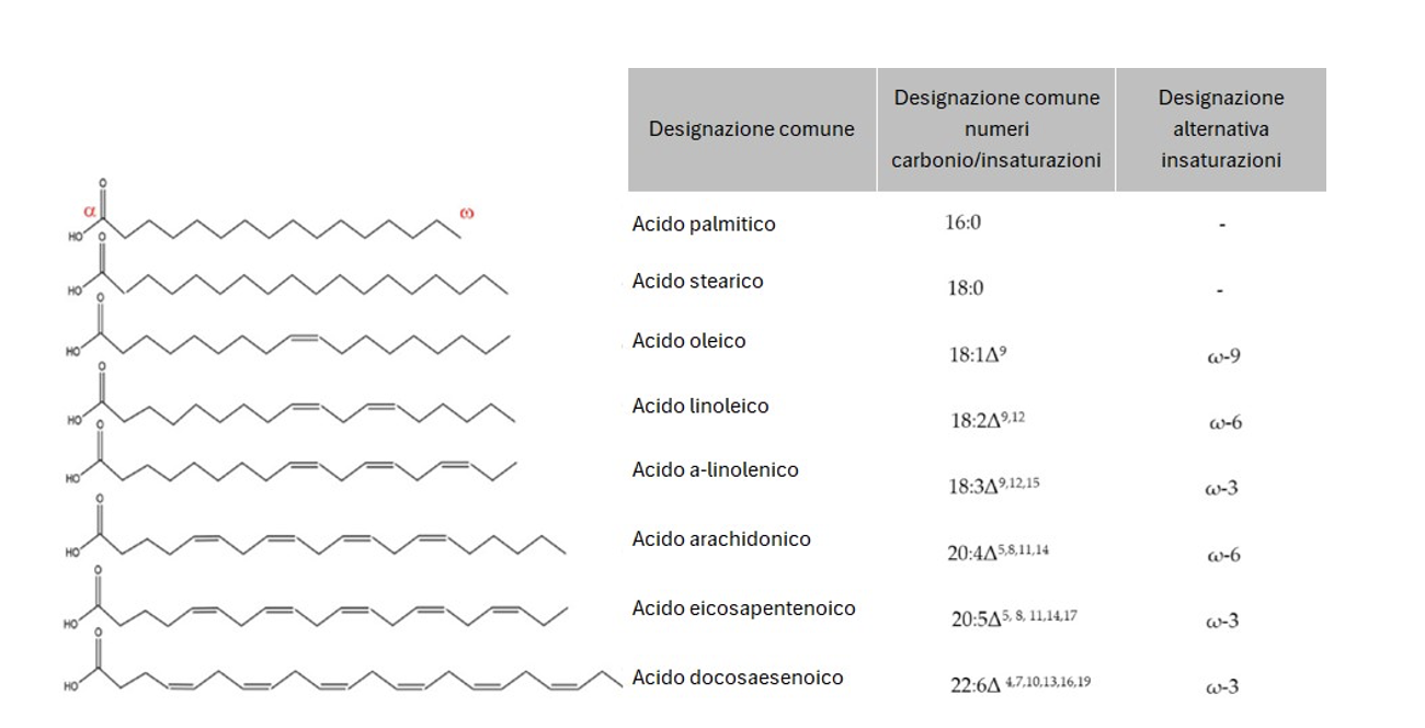 Strutture di alcuni acidi grassi con differenti lunghezze di catena carboniosa e numero di insaturazioni