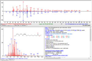 La tecnica di elezione per la successiva determinazione degli esteri ottenuti da sostanze grasse è la tecnica gascromatografica, che separa i componenti della miscela in base alla loro temperatura di ebollizione ed alla loro diversa affinità per un supporto attraverso il quale viaggiano e con il quale interagiscono. Essa è tradizionalmente associata alla rivelazione mediante ionizzazione di fiamma, FID, che sfrutta, ai fini della rilevazione, la combustione dei composti che mano escono dalla colonna capillare contenente il supporto atto a separare i composti. Tale tipologia di rilevazione, però, dà solo alcune indicazioni orientative sulle caratteristiche dei diversi composti che man mano fuoriescono dalla colonna di separazione e bruciano per dare il segnale, in tempi che possono dipendere dalla dimensione e polarità delle molecole, a parità di altre condizioni sperimentali. L’unico modo di identificarlisarebbe attraverso il confronto con il tempo di uscita di un composto noto, analizzato nelle stesse condizioni cromatografiche. Questa limitazione diventa rilevante e onerosa nel caso di miscele con un numero elevato di composti, inaspettati oltre che incogniti.