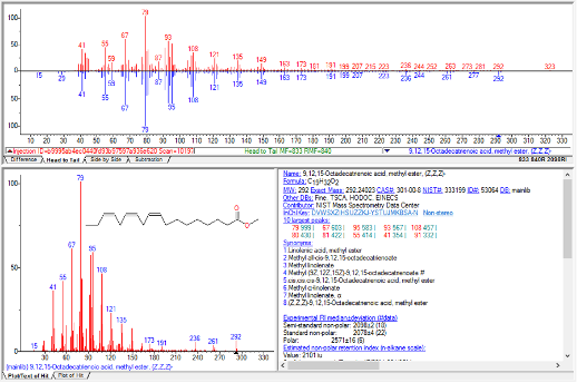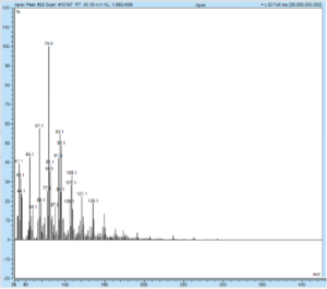 L’utilizzo della rivelazione post GC con filtro di massa ed il confronto con librerie spettrali ha permesso una identificazione relativamente agevole e con discreta certezza di tali composti anche senza l’iniezione di sostanze pure da utilizzare come riferimento, come sarebbe stato necessario fare nel caso di utilizzo di rilevazione FID, sebbene tale pratica non avrebbe assicurato una identificazione univoca a causa della possibilità di co-eluizione di composti con caratteristiche simili.