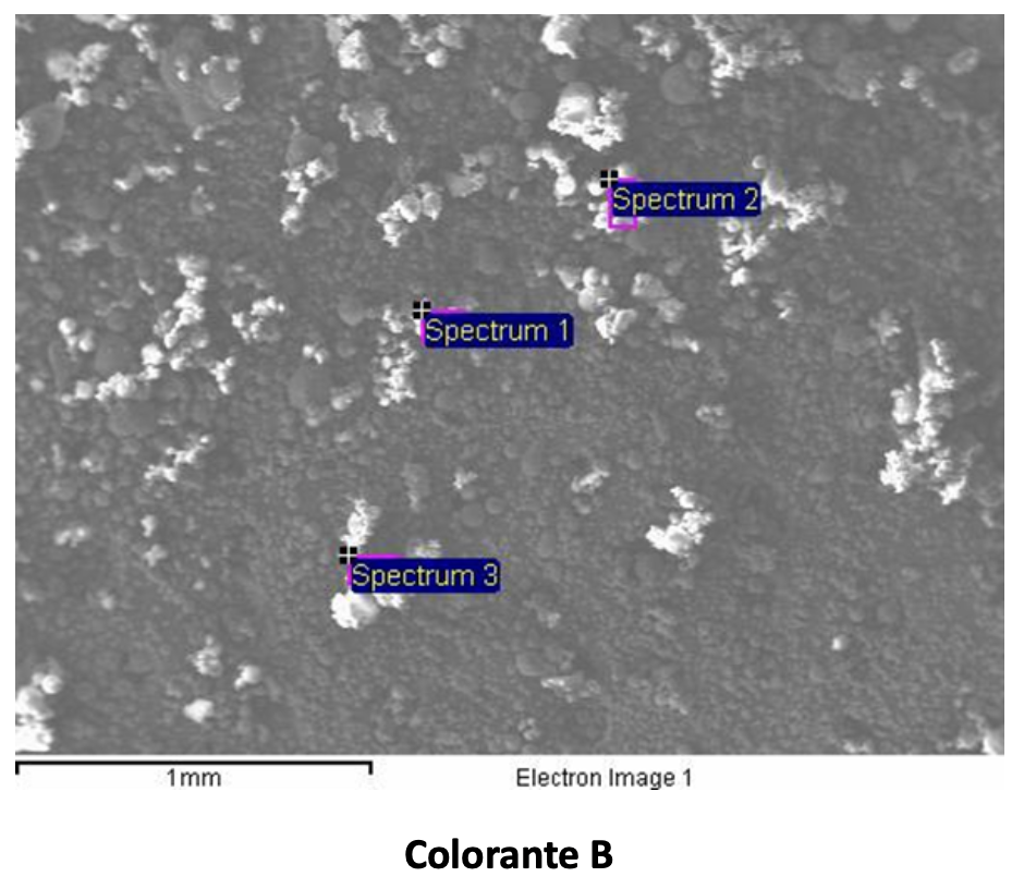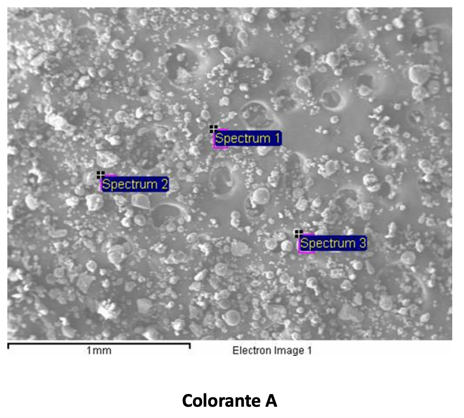 In alcuni casi anche la microanalisi con sonda a raggi X dei coloranti utilizzati può rilevarsi utile nell’intercettazione del difetto. Nello specifico si riportano di seguito i risultati di una microanalisi condotta su due coloranti utilizzati per un pellame che ha manifestato successivamente il fenomeno di bronzatura.