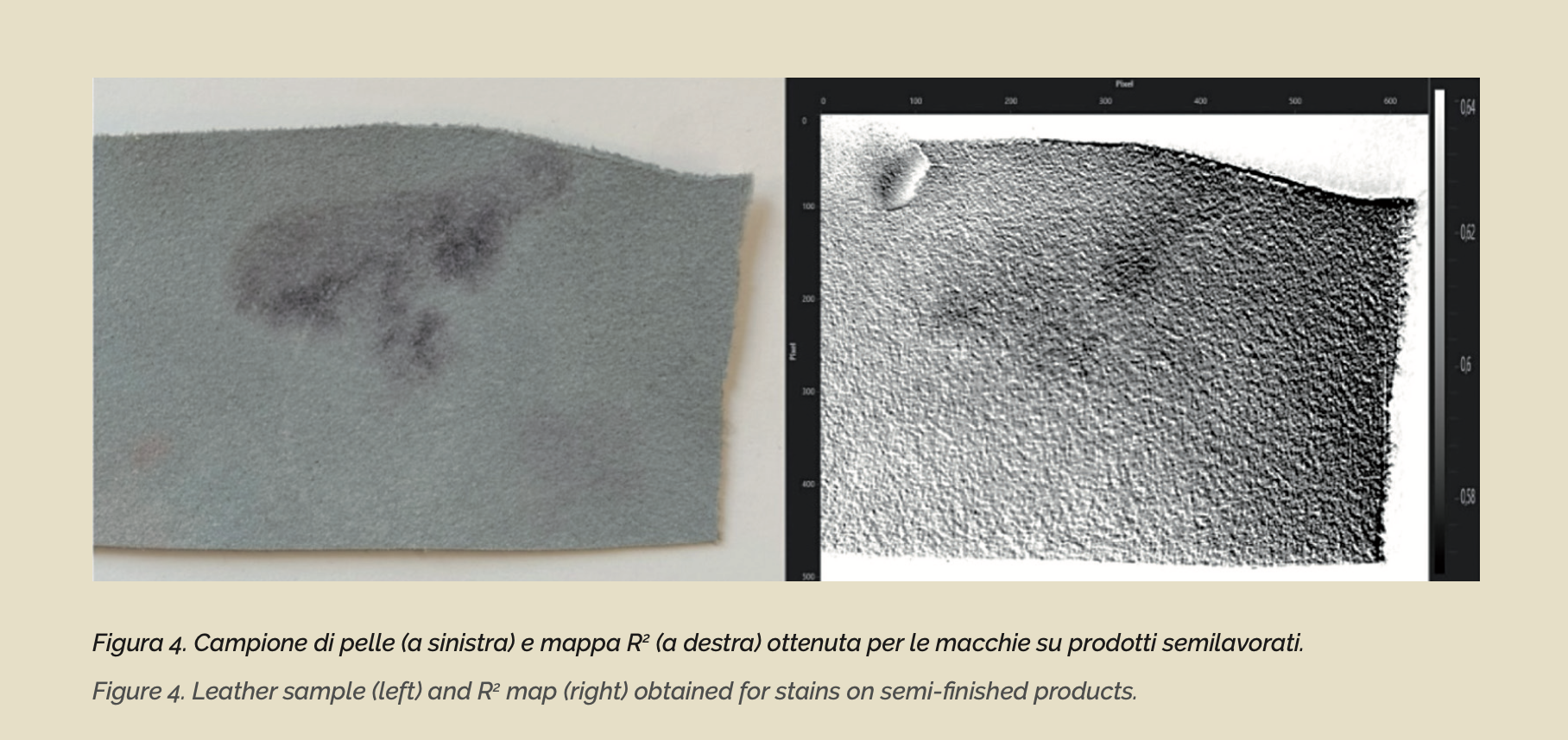 Le macchie sui prodotti semilavorati costituiscono un altro difetto che si può riscontrare nelle fasi di trattamento delle pelli, e possono essere riconducibili a diverse cause; alcune macchie possono essere difatti causate da ossidi metallici, dalla precipitazione di saponi di calcio o di cromo, oltre che essere determinate da possibili attacchi microbici. La natura delle macchie influenza lievemente la trasmissione del calore. Infatti, la mappa Rª non evidenzia con chiarezza l’estensione ed il perimetro del difetto. In questo caso, ulteriori indagini con diversi setup sperimentali (es. riscaldamento della pelle con diversi profili di emissione termica, utilizzo di termocamere con diverse bande spettrali› potrebbero rendere l’analisi termografica più accurata.