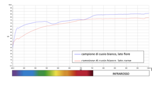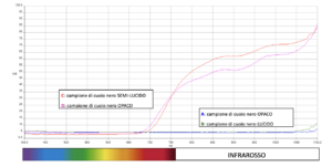 I cuoi identificati con C e D nella figura precedente utilizzano rifinizioni di colore nero, come si evince dal totale assorbimento nel campo del visibile, ma che inglobano pigmenti capaci di riflettere le radiazioni del campo infrarosso, minimizzando, quindi, l’assorbimento dell’energia trasportata da tali radiazioni.
