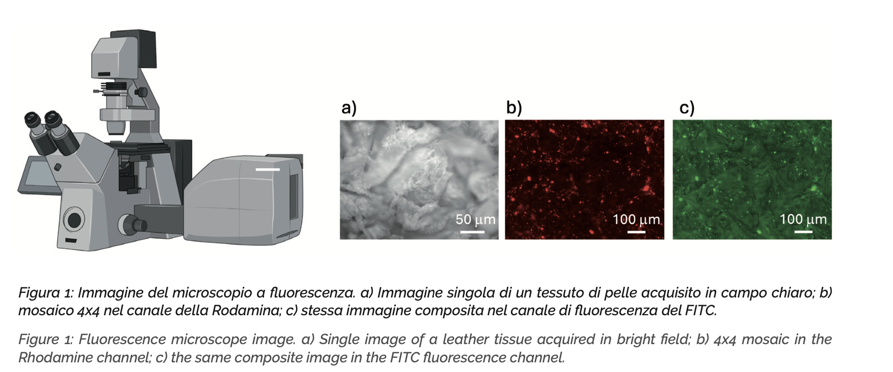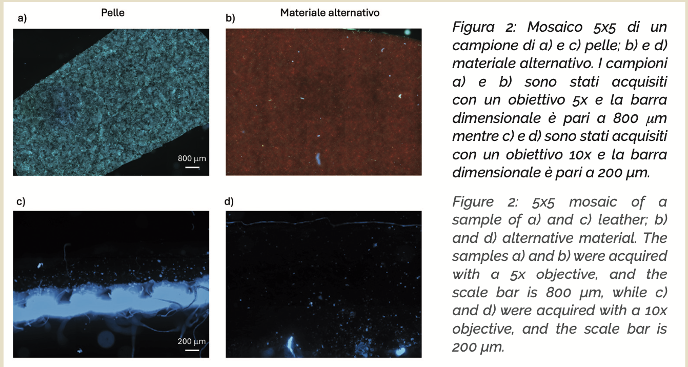 Il “Made in Italy” rappresenta da sempre un sinonimo di qualità, eleganza e artigianalità nel mondo della moda e del design. Tra i materiali che incarnano al meglio questi valori, la pelle occupa un posto di rilievo. Utilizzata per la produzione di articoli di abbigliamento, pelletteria, calzature, interni di automobili, di componenti di arredo e, più in generale, articoli destinati al mercato del lusso, la pelle italiana è rinomata per la sua eccellenza in termini merceologici e le sue elevate prestazioni. Le pelli di alta qualità sono il frutto di una lunga tradizione artigianale e di un’accurata selezione delle materie prime. Ogni fase del processo produttivo, dalle operazioni di riviera, alla concia, post-concia e rifinizione, è eseguita con meticolosa attenzione per garantire un prodotto finale privo di difetti1-4. Questo livello di perfezione non solo conferisce un valore estetico e tattile ineguagliabile, ma assicura anche una maggiore durata e resistenza nel tempo. La pelle naturale, che costituisce un sottoprodotto dell’industria alimentare, è sottoposta a trattamenti fisici e chimici che conferiscono al materiale una notevole resistenza meccanica e stabilità contro il calore, l’umidità e l’usura. Le caratteristiche uniche della pelle includono una struttura specifica formata da pori e follicoli piliferi, che variano a seconda della specie animale da cui proviene; in tal senso, la corretta identificazione di queste caratteristiche fisiologiche, scongiura il rischio di frode commerciale attraverso l’etichettatura ingannevole, dove la provenienza dell’animale può essere falsamente dichiarata per aumentare il valore del prodotto. Materiali alternativi che imitano la pelle, inoltre, sono prodotti attraverso processi industriali che utilizzano di sovente materiali plastici per creare un prodotto che simula l’aspetto e la sensazione della pelle naturale. Questa alternativa è diventata popolare grazie al suo costo inferiore e alla possibilità di produzione in massa. Tuttavia, i materiali alternativi, oltre a presentare aspetti potenzialmente penalizzanti sul piano ambientale, presentano anche limitazioni significative, come la scarsa permeabilità, e la bassa durabilità. Inoltre, sul piano ecotossicologico, i materiali alternativi possono contenere sostanze chimiche nocive, che potrebbero rappresentare rischi significativi per la salute dei consumatori. Negli ultimi anni è cresciuto l’interesse nel distinguere tra pelle, nota per la sua qualità e autenticità e materiali alternativi, particolarmente per il “Made in Italy”. Questo interesse è dovuto alla necessità di proteggere l’integrità del prodotto italiano di punta, nei settori produttivi rappresentati, minacciato dalla diffusione di materiali sintetici che imitano la pelle. Le tecnologie avanzate di analisi e certificazione sono diventate fondamentali per garantire l’originalità dei prodotti italiani5 . Prodotti falsificati, spesso realizzati con materiali scadenti e tecniche di lavorazione inadeguate, non solo danneggiano l’immagine del “Made in Italy”, ma compromettono anche la fiducia dei consumatori e minano l’economia delle imprese artigiane. Tecnologie avanzate di analisi sono inoltre importanti per la rilevazione di difetti e imperfezioni sia durante il ciclo di lavorazione che nel prodotto finito, in modo da garantire l’elevato livello di qualità connesso con il Made in Italy. In questo lavoro è stata utilizzata una tecnica di microscopia ottica avanzata per analizzare la texture di superfici estese di pelle e per caratterizzarne le proprietà e gli eventuali difetti. Tale approccio combina l’uso di un microscopio ottico automatizzato, collegato ad una telecamera ed equipaggiato con obiettivi per campo chiaro ed epifluorescenza, con tecniche di analisi delle immagini. Il microscopio è dotato di una piattaforma di posizionamento motorizzata che consente di spostare il campione in maniera controllata e ad alta precisione. L’acquisizione delle immagini viene effettuata in due modalità principali: • Campo chiaro: la luce bianca viene trasmessa o riflessa dal campione, illuminando la superficie e rivelando dettagli strutturali e difetti. • Epifluorescenza: utilizza specifiche lunghezze d’onda di luce per eccitare le molecole fluorescenti nel campione, rivelando caratteristiche non visibili in condizioni normali. Questa tecnica è particolarmente efficace per evidenziare difetti nascosti grazie a trattamenti chimici o coloranti applicati alla pelle. Con queste tecniche, è possibile ottenere una visione dettagliata del campione. Utilizzando il sistema di posizionamento motorizzato, viene effettuata una scansione automatica del campione, in cui la telecamera acquisisce le immagini che vengono poi assemblate insieme attraverso un algoritmo di “stitching”. Viene così generata un’immagine composita di notevoli dimensioni spaziali (dell’ordine dei cm). Questa immagine può essere esaminata nel suo complesso mediante routine di analisi delle immagini e/o ingrandita per estrarre caratteristiche specifiche. Come esempio, le immagini riportate in Fig. 1 mostrano un’immagine singola in campo chiaro (a) e due immagini composite derivanti da mosaici 4×4 (b e c), acquisendo in quest’ultimo caso 16 immagini in due diversi canali (quello del Nile Red e quello del FITC). Le immagini in epifluorescenza mostrano un segnale apprezzabile in entrambi i canali utilizzati, che può essere attribuito non solo a riflessione della luce, ma anche all’autofluorescenza della pelle. Per verificare questa attribuzione, sono state condotte delle osservazioni anche nella sezione trasversali di campioni di pelle, come illustrato di seguito.