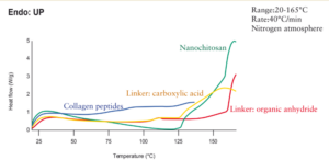 promettente. Funzionalizzazione delle NC per la concia. Recenti pubblicazioni accademiche hanno riportato risultati promettenti nelle reazioni di concia su pelle/pellame o substrati di collagene utilizzando vari polisaccaridi. In genere l’efficacia di queste reazioni viene valutata attraverso analisi spettroscopiche, test di stabilità termica e valutazioni antibatteriche (Ding, 2020). Ad esempio, spesso l’alginato di sodio e la cellulosa vengono modificati per reazione con ossidanti, come il periodato di sodio, o con molecole organiche, come gli epossidi ammino-funzionalizzati, per aumentare la loro reattività nei confronti dei gruppi funzionali del collagene o per migliorare le loro proprietà antibatteriche. Nell’ambito di un progetto parallelo del MICS (4.01 SOLARIS – Sustainable Options for Leather Advances and Recycling Innovative Solutions), la derivatizzazione di NC prodotta da scarti tessili è stata ottenuta con successo utilizzando molecole bifunzionali. Anidridi organiche o acidi carbossilici con gruppi aldeidici sono stati usati per collegare la nanocellulosa con le catene peptidiche del collagene, scelte come substrato di riferimento per il pellame. Oltre a queste soluzioni, è stato prodotto anche il nanochitosano attraverso la lavorazione del chitosano in DES. In questo caso, il nanochitosano interagisce direttamente con i peptidi di collagene. È interessante notare che le misurazioni DSC mostrano una migliore stabilità termica per tutte le pelli ottenute rispetto a quella dei peptidi di collagene non trattati (Fig. 2).