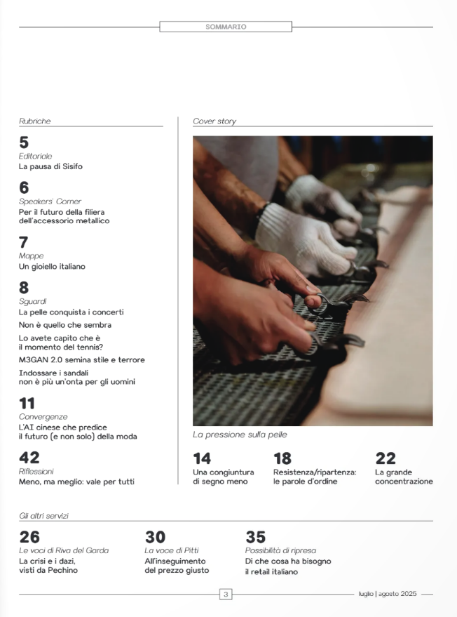 Questa rivista raggiunge ogni mese le scrivanie di imprenditori e manager conciari e calzaturieri, della pelletteria e dell’arredamento, ma non solo: i suoi lettori sono anche commercianti e intermediari di pellami, produttori chimici e di macchinari, operatori istituzionali e catene commerciali.